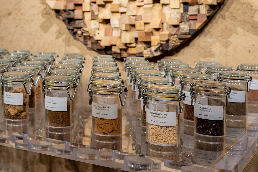 Ed è proprio questo che la rende l'opera dei sensi: il profumo. Il sigillo della Cantina scomposto in tanti piccoli tasselli di legno, rimanda ai profumi in vasetto dei legni corrispondenti, per sentire olfattivamente la materia: una sorta di tatto che parla all'olfatto dopo la vista. Ad ognuna delle 199 tipologie di legno impiegate in “Opera sensoriale” è stata dedicata la wooden box di una tiratura limitata di Magnum di Franciacorta Majolini Brut, dal titolo omonimo.