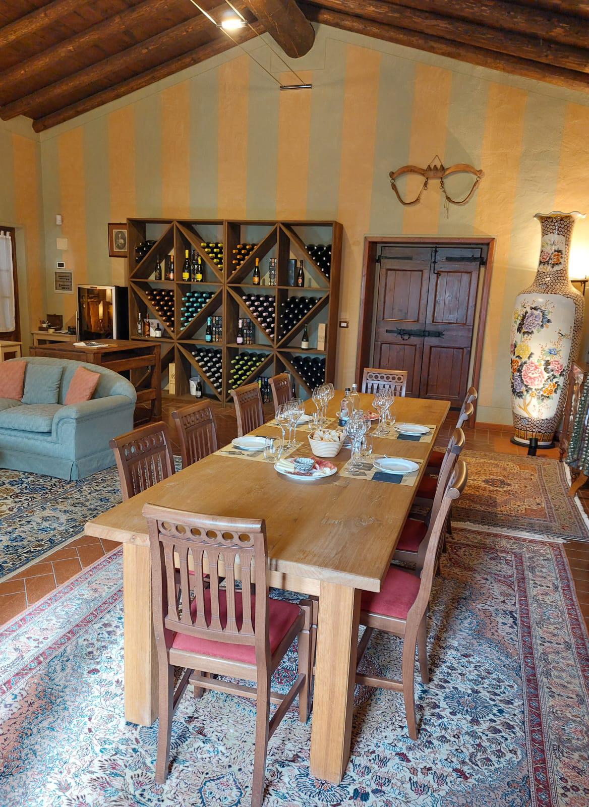Arredi caldi, tappeti, luci morbide e la presenza del vino rendono l’ambiente accogliente e informale, lontano dalla rigidità delle sale riunioni tradizionali.