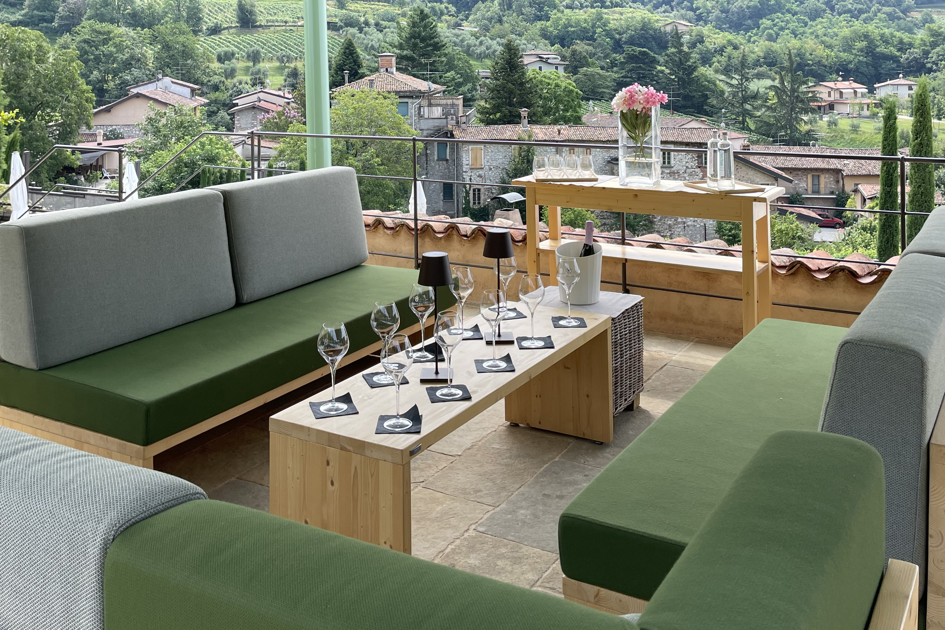 Qui il tempo si distende: un calice sul tavolo, una conversazione che continua, il paesaggio che fa da sfondo.